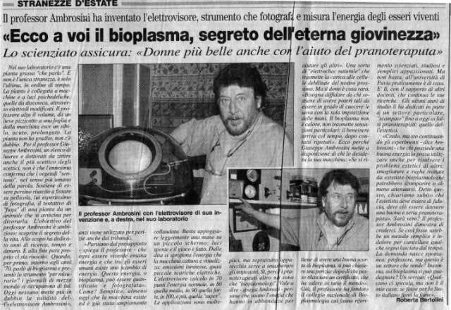 From the 1970s onwards, he became increasingly interested in alternative medicine and parapsychology. Ambrosini’s research concentrated on one main question: when natural healers such as Reiki practitioners raise or place their hands on a subject, what actually happens? The scientific answer is “nothing”, and yet the subject often claims to undergo some form of transformative experience during or after such an encounter – which some assert amounts to healing. Ambrosini asserted that what was transferred from the healer to the subject in a successful healing session was an essence that he called bioplasma, which he identified as a life force capable of effecting rejuvenation. He devised and patented a number of machines (including the elettrovisore) and systems that aimed to provide evidence of the transmission of bioplasma and these were enthusiastically discussed in the press and presented at several public trials.