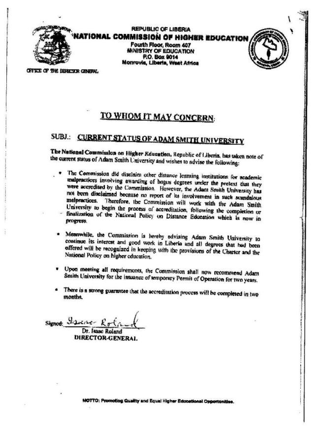 Some time after my graduation, Liberia announced the formulation of a new national policy on distance education. The National Commission on Higher Education, which had been established as a division of the Ministry of Education to oversee the university sector, issued a statement concerning Adam Smith University of Liberia, which was received by fax on September 17, 2005.
