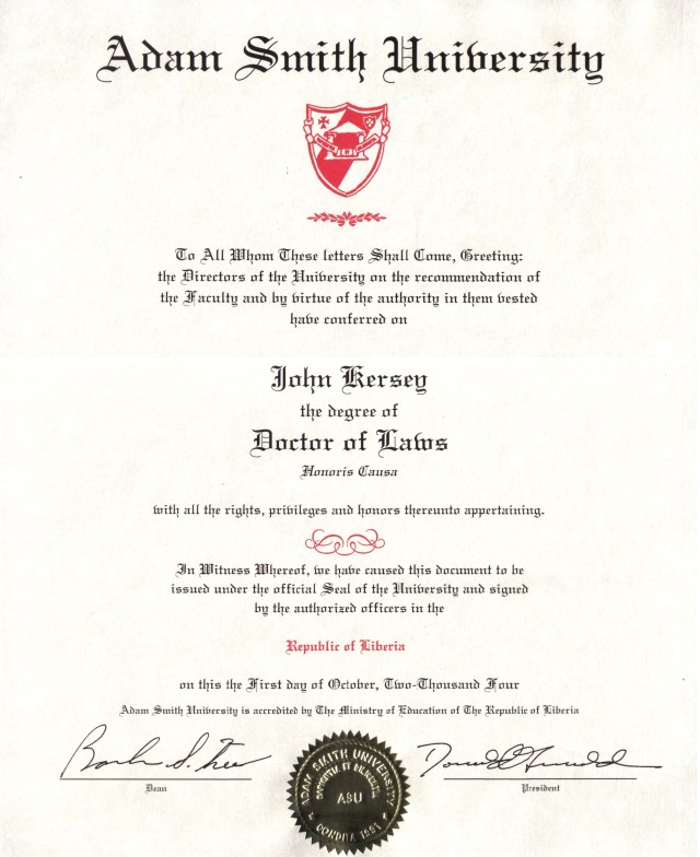 Liberia subsequently introduced an accreditation process for universities, conducted by the Ministry of Education. Adam Smith University was granted accreditation by the Ministry of Education on October 8, 2001. The accreditation permitted the offering of degrees in specific majors by distance education as well as the award of honorary doctorates.