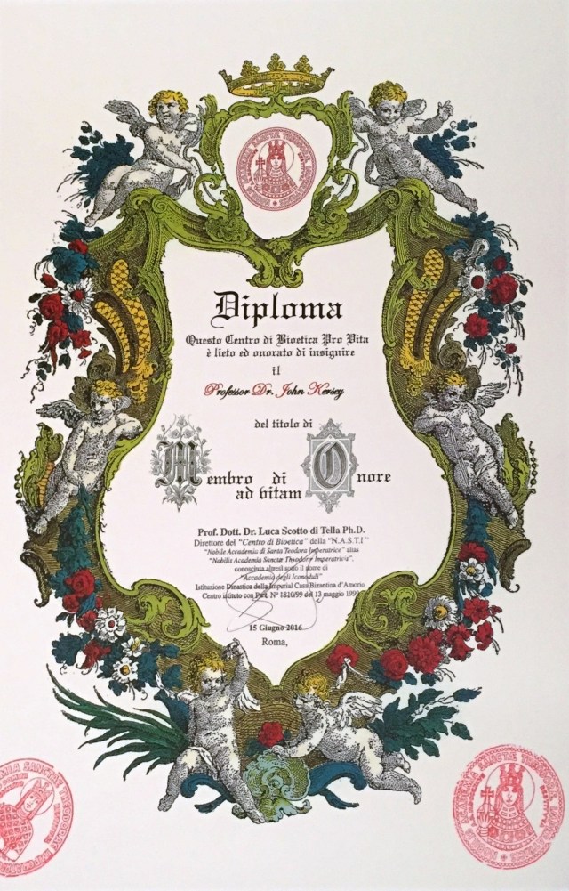 I have been honoured by the Nobile Accademia di Santa Teodora Imperatrice (NASTI), Rome, Italy. The Accademia is recognized as a subject of international law by the Italian government and since 1942 has been recognized as a sodality of the faithful by the Archdiocese of Capua of the Roman Catholic Church.