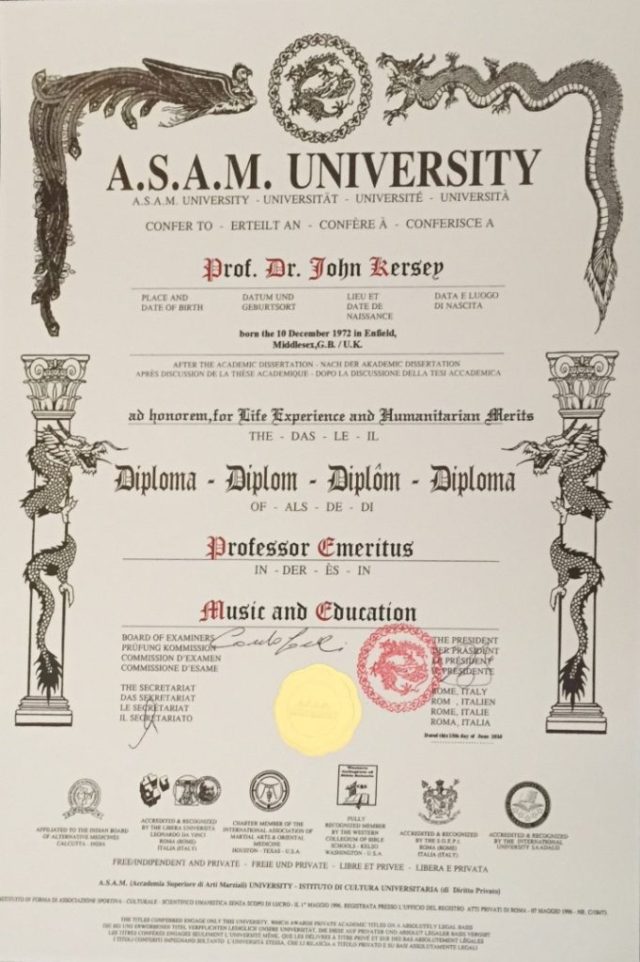 I have received the honorary degree of Master of Science in Bioethics from the A.S.A.M. University in Rome, Italy. The basis of the award is “for Life Experience and Humanitarian Merits”. I have also been appointed as a Professor Emeritus in Music and Education, Sacred Theology and Moral Philosophy of the University, and as National Delegate for Great Britain and Northern Ireland.