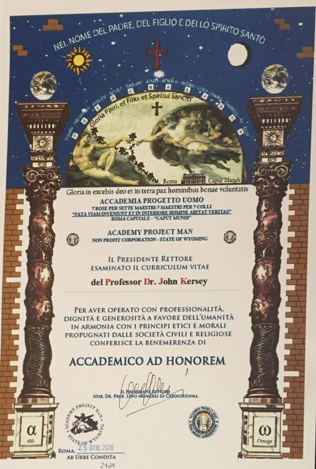 The “Academy Project Man” (Accademia Progetto Uomo), is incorporated in the State of Wyoming, USA, and also based in Rome, Italy. Its activities include the organization of conferences and the conferral of prizes for humanitarian work. I have been honoured by the Academy with the distinction of Honorary Academician.