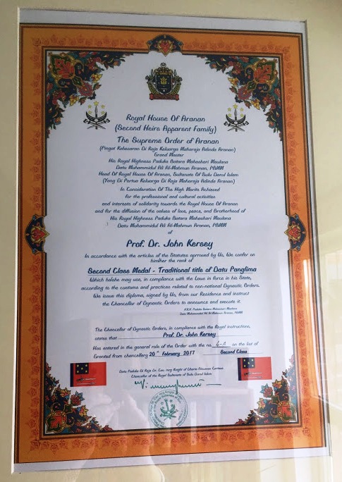 The Head of the Royal House of Maharaja Adinda Aranan, H.R.H. Datu Muhammidul’ Ali Al-Mahmun Arunan, PBMM etc. has bestowed the Second Class Medal and title of Datu Panglima in the Supreme Order of Aranan upon me. This follows my earlier appointment as Datu Paduka in the Grand Order of Sultan Bantilan Muizuddin in 2016.