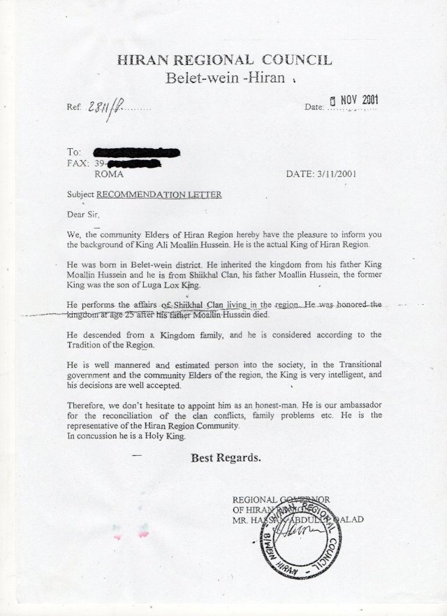 I have had the honour to be created a Prince of the Royal Principality of the Upper Region of Hiran, Royal House Shikal, Somalia. The Head of the Royal House Shikal is H.E. and H.R.H. the Ambassador, Federal, Special Police and Military Colonel (G.di F.), Royal Prince Professor Dr Ali M. (Moallim) Hussen, son of the late traditional King of the Hiran Region of Somalia, H.R.H. the Prince Moallim Hussen, descendant of the Sultanate of Mudaffar.
