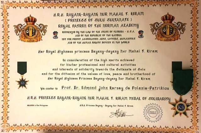 I was honoured to receive the Medal of Solidarity awarded by H.R.H. Princess Dayang-Dayang nur Mahal T. Kiram. The Princess is the sister of Ampun Sultan Muedzul Lail Tan Kiram, the current Head of the Royal House of Sulu.