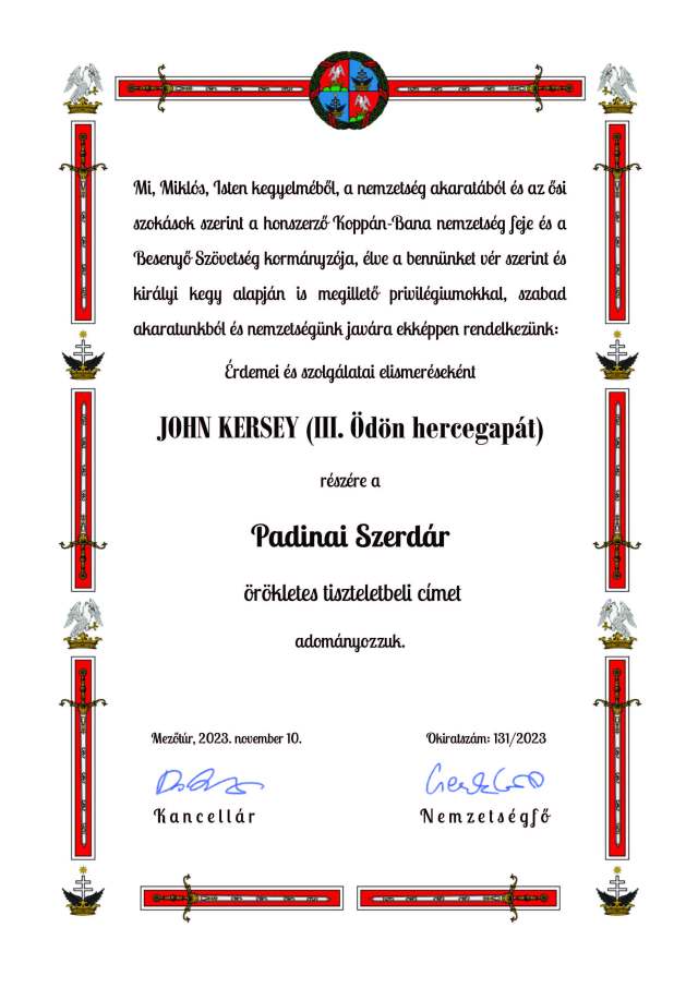 The Hungarian noble House of Cseszneky (de Csesznek(Vár) et Milvány) has previously established relations with my own house. Its head, His Illustrious Highness Count Miklós M. M. Cseszneky, is my cousin, and we share descent from the House of Rurik of Russia and the medieval Kings of Poland. I have been very pleased to receive further dynastic honours from the House.