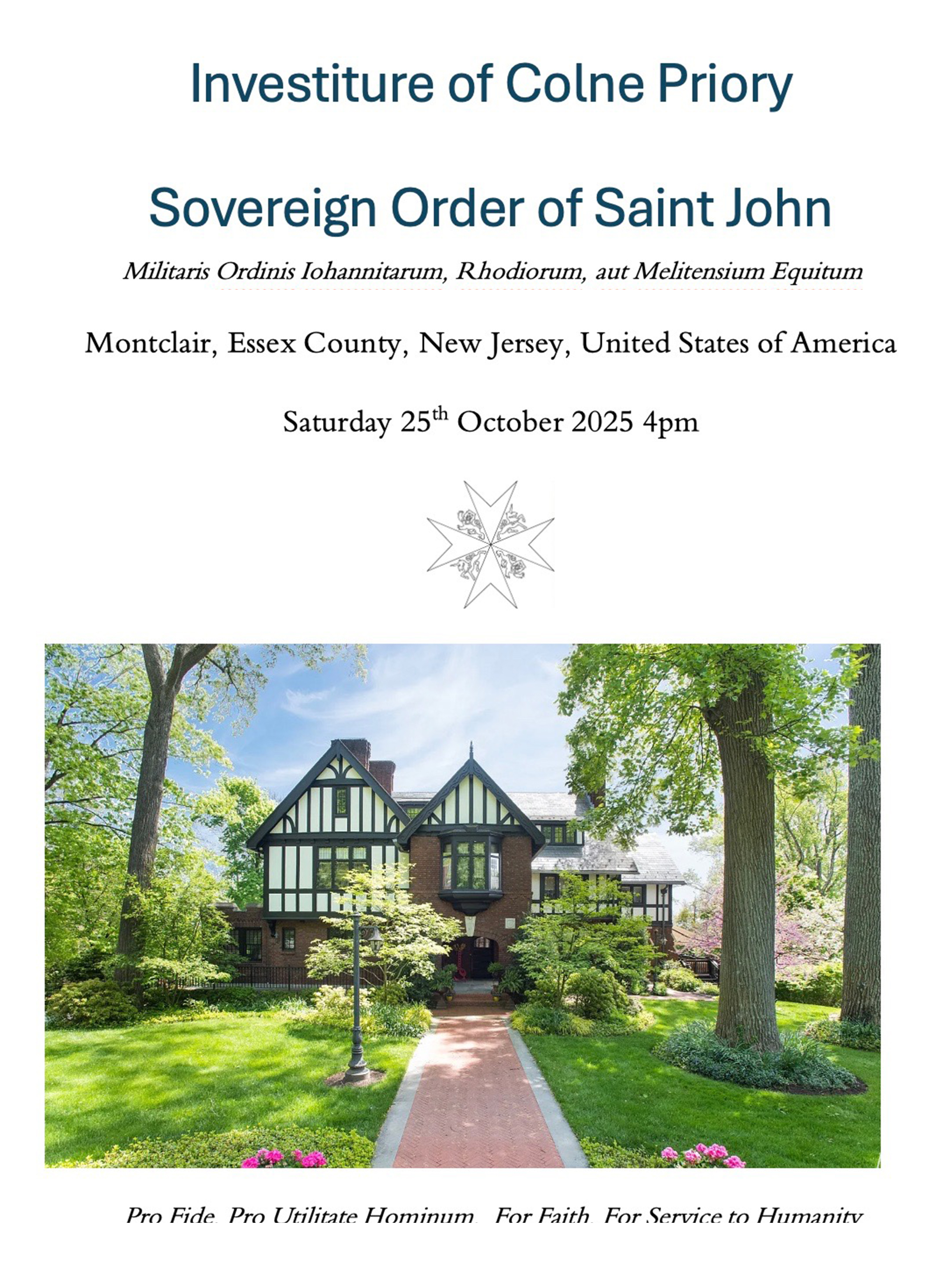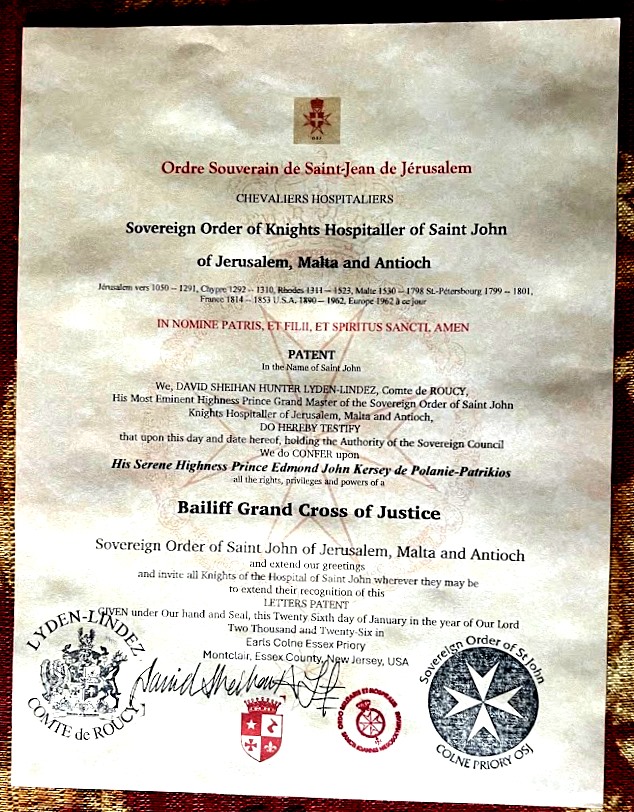 The Earls Colne Essex Priory of the Sovereign Order of Knights Hospitaller of St John of Jerusalem, Malta and Antioch, met on 26 January at the Metropolitan Club in Washington, DC. At the meeting under the chairmanship of the Prince Grand Master, my appointment as a Bailiff Grand Cross of Justice of the Order was affirmed. This representation of the Johannine tradition shares a common origin with several other branches with which I have had association, representing a continuation of the Hereditary Commanderies which embodied the Russian tradition of the Order.