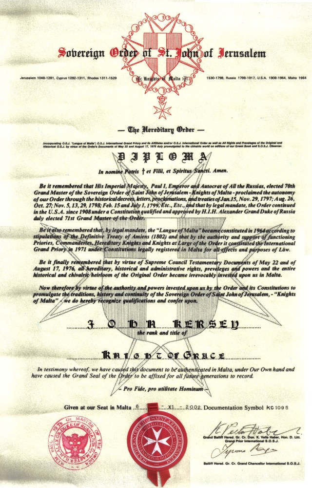 Unfortunately, the Order in England became inactive after the death of Kenneth Benfield in 2007, and my letters to the English office and the Malta headquarters received no reply.