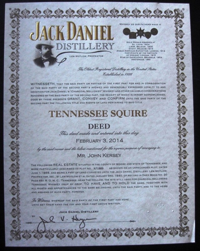 Following World War II, the demand for Jack Daniel’s whiskey was higher than production could keep up with and their first National Sales Manager, Winton Smith, was looking for a way to keep customers around the country happy while supplies were low. He decided that loyal fans who had written the Distillery saying they could not get any Jack Daniel’s whiskey would instead receive a plot of land, a square inch of unrecorded property on the Distillery’s grounds. This would make them part owners, or Squires, and the first members inducted into the Tennessee Squire Association.