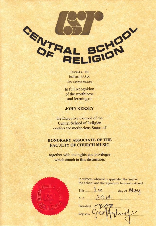 I have been delighted to have received Honorary Associateship of the Faculty of Church Music of the Central School of Religion.