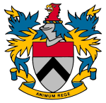 The Rector wears a gold chain of office from which is suspended a badge bearing a stylised lyre circumscribed by an oval band.