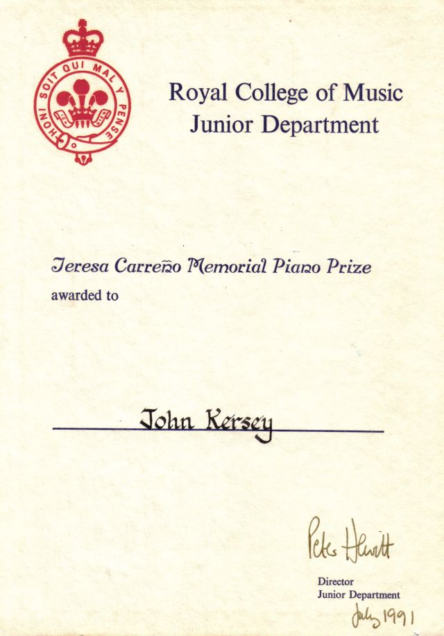 The Local Authority Junior Exhibition Awards were scholarships awarded by the London boroughs that allowed musically gifted school pupils to begin their training at the London conservatoires alongside their regular schooling, by attending the conservatoires’ Junior Departments free of charge on a Saturday. These awards, too, were subject to competitive audition, and I was fortunate to win a London Borough of Enfield Junior Exhibition Award to the Royal College of Music in 1987. I was then aged fourteen, and, as a late starter, was only in my fourth year of piano lessons.