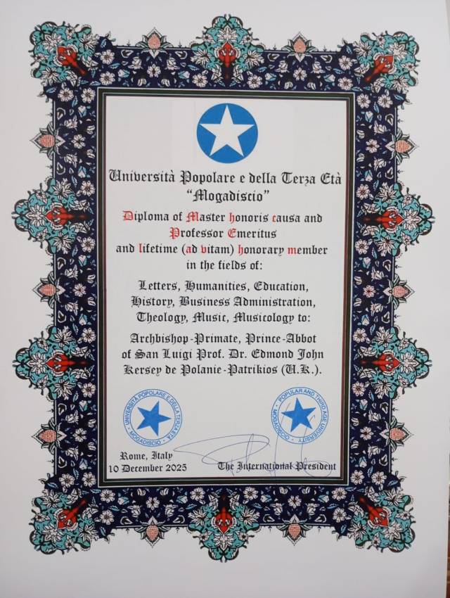 The Università Popolare e della Terza Età “Mogadiscio” has appointed me as Honorary Chief Chaplain: