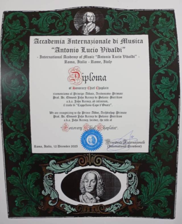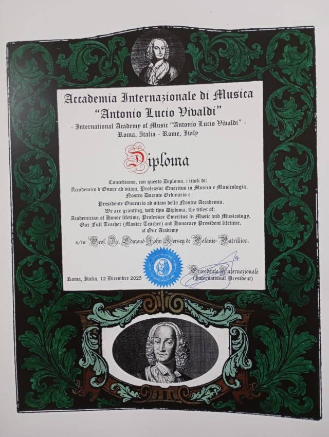 The Accademia Internazionale di Musica “Antonio Lucio Vivaldi” has appointed me as Honorary Life President, Honorary Chief Chaplain, Professor Emeritus in Music and Musicology, Master Teacher and Honorary Life Academician.