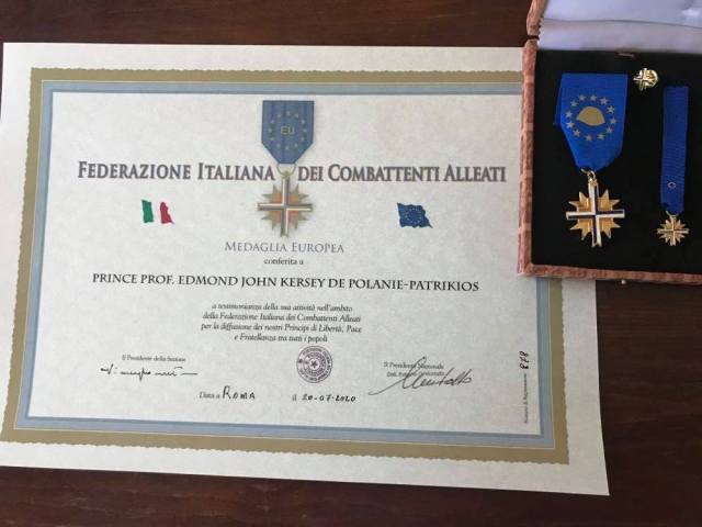 I have been honoured to receive the Medaglia Europea of the Federazione Italiana dei Combattenti Alleati. FIDCA was founded in 1972 as an association of European ex-combatants and others who were supportive both of the European ideal and of the sacrifices of those who had sacrificed themselves for freedom. FIDCA was recognized as a distinct legal personality in Italy by Presidential Decree n.305 of 9/4/1986, and by means of DPR 27-2-1990, it was placed under the direct patronage of the Italian Ministry of Defense.
