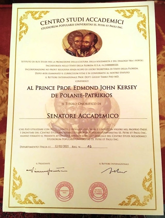 I was honoured by the Centro Studi Accademici “Studiorum Popularis Universitas Ss. Petri et Pauli”, which conferred an honorary appointment as Academic Senator upon me. The Centro was incorporated in Florida, USA, as a religious institution in 2021, and was under the Presidency of Prof. Dr. Vincenzo Cortese of Italy. Sadly it was dissolved in 2022.