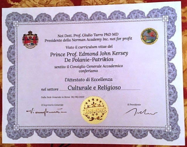The Norman Academy in Rome, Italy, of which I am an Academician of Honor, has further honoured me with an Attestato di Eccellenza in the sectors of Culture and Religion.