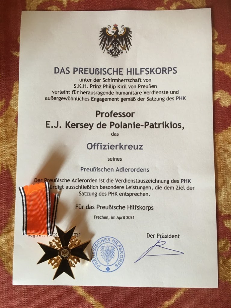 I have been honoured to receive the Officers’ Cross of the Prussian Order of the Eagle, which is organized as the order of merit of the Preussische Hilfskorps, a non-profit charitable body under the patronage of H.R.H. Prince Philip Kiril of Prussia. I am grateful to the President of the Preussische Hilfskorps for his kind nomination.