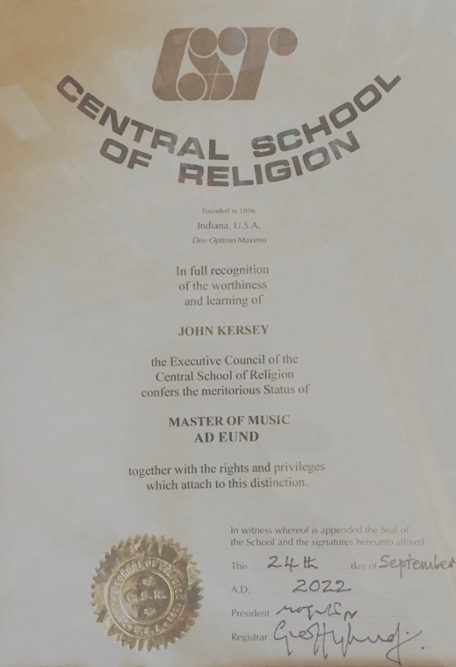 Having previously been made a Fellow of the Central School of Religion and successively Honorary Associate and then Fellow of its Faculty of Church Music, I was delighted to receive the degree of Master of Music from the School awarded ad eundem. The basis of this award is the degree of Master of Music that I received from the Royal College of Music in 1997.