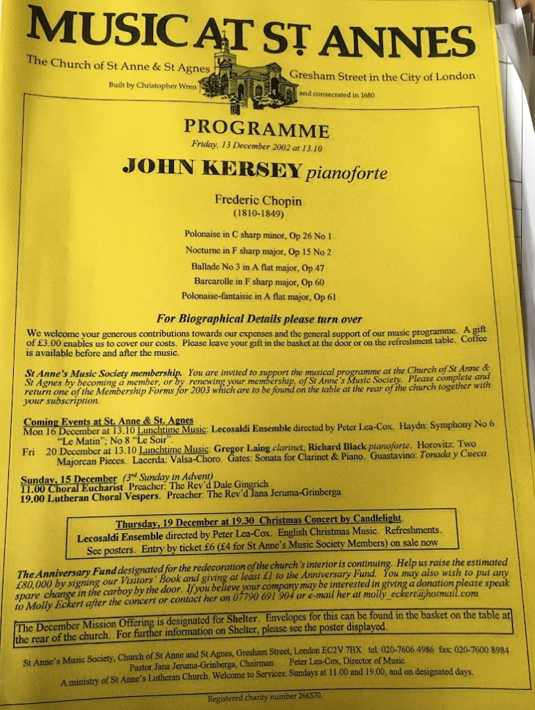 In the first movement, John Kersey set himself a challenging tempo, and didn’t overdo the rubato. The result was spectacular. Even on its own, to hear that movement was worth going all the way to Chingford for. The third movement was even better. As to the last movement, just before the end I found myself writing in the little A6 book I carry with me what became the following words: