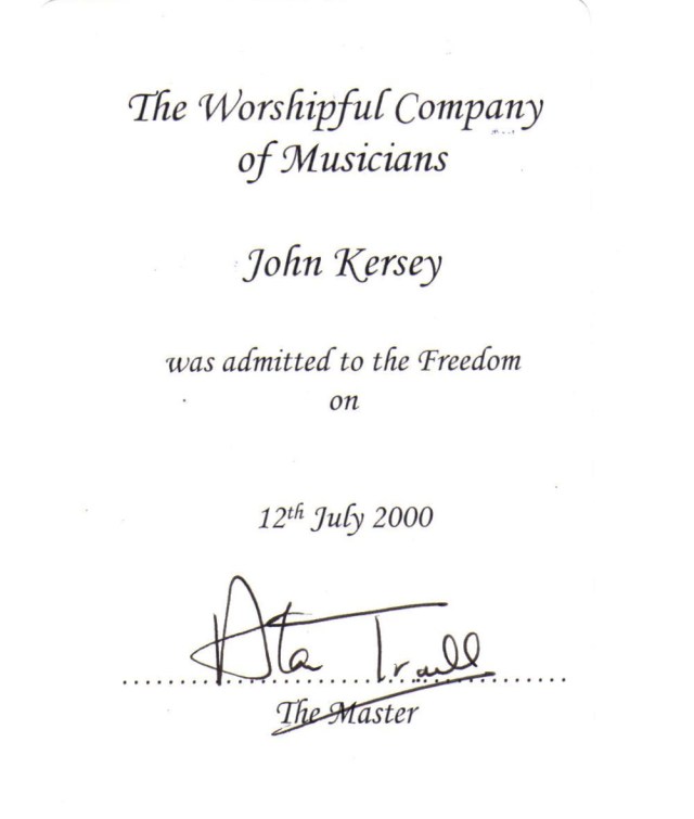 Following my proposal by two Past Masters of the Worshipful Company of Musicians, the late John Iles senior and junior, I was admitted to the Freedom of the Company in July 2000.
