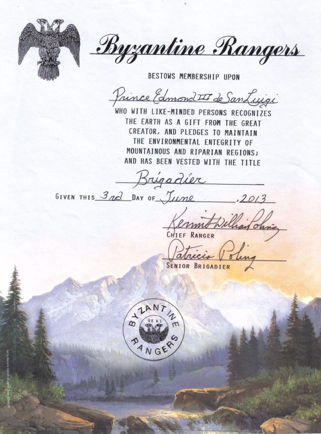 The Byzantine Rangers were established by my late adoptive father, Prince Kermit Poling de Polanie-Patrikios, who was a direct descendant of a number of the Byzantine emperors. It was a body dedicated to the preservation of the natural environment, particularly mountainous and riparian locations, and to the understanding of the earth as a gift from God.