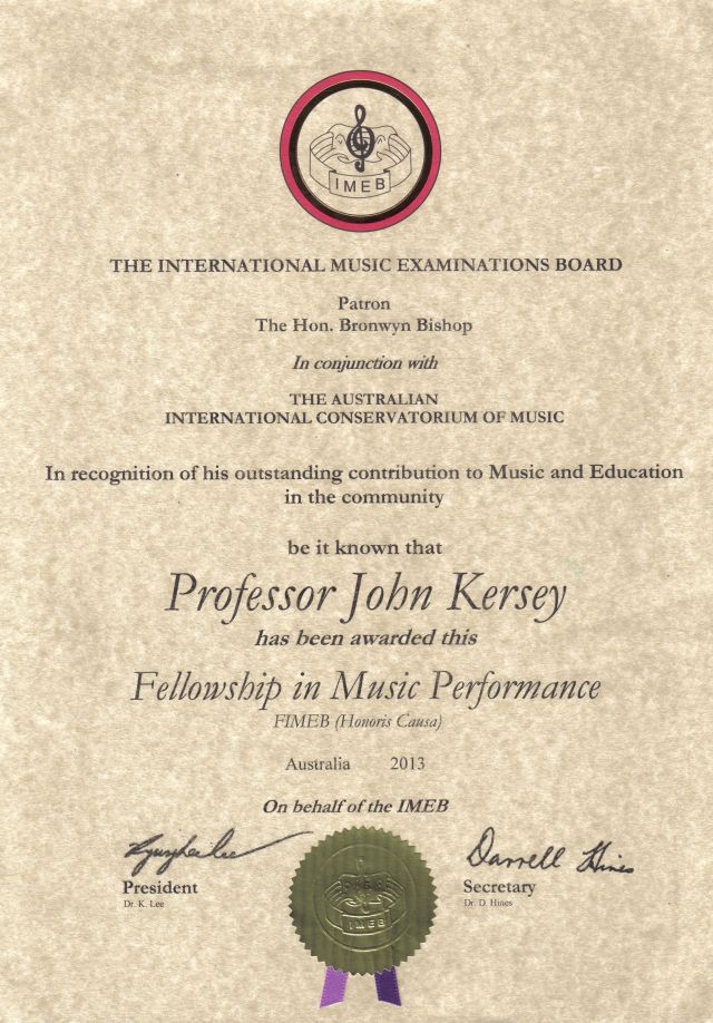 In 2013, I was nominated for the award of a Fellowship in Music Performance honoris causa by IMEB. The citation reads “in recognition of his outstanding contribution to Music and Education in the community.” The award was made in conjunction with the former Australian International Conservatorium of Music.