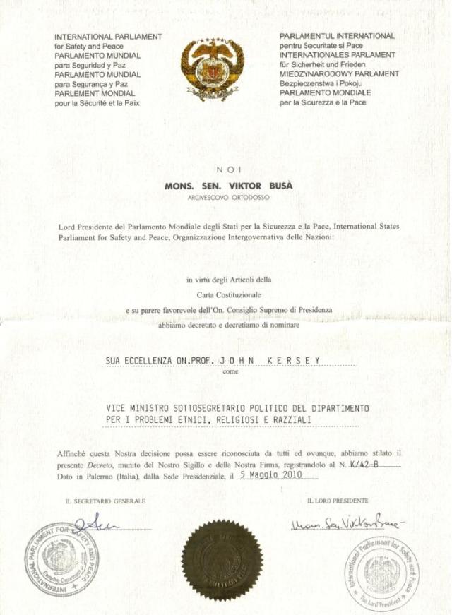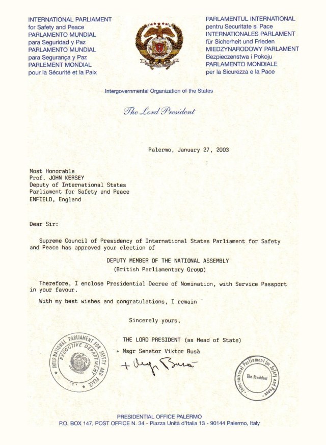 The International States Parliament for Safety and Peace (ISPSP) was founded in December 15, 1975 by a letter of the Constitution of the International Legislative Assembly. It was juridically recognized by the International Law and the first nations to recognize it were the United States and Italy. It was a parallel organization to the United Nations and, like the United Nations, had representative ambassadors from all nations. The headquarters of the ISPSP was in Italy. The Lord President of the Parliament was the late Archbishop Viktor Busa, President of the Council of the States. In 2005, he received the Grand Cross of the Order of Independence of Equatorial Guinea and also the Decoration of Diplomatic and Humanistic Merit “Mahatma Gandhi”. Msgr. Viktor Busa was in 2007 appointed as Vice President of the Council of State Security and of the Committee of World Culture and Sports (DUMA), as well as Expert Counselor in Problems of National Security of Russia.