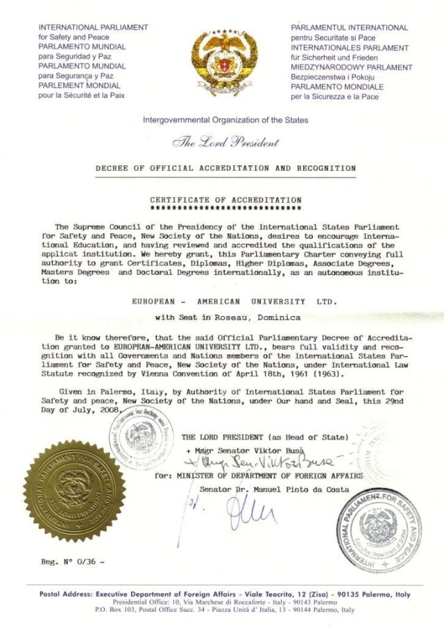 The ISPSP had a significant interest in the support of educational projects, and showed itself willing to support non-traditional education. In 2008, it issued a Parliamentary Charter and Decree of Accreditation and Recognition to European-American University (Dominica) which was under my presidency.