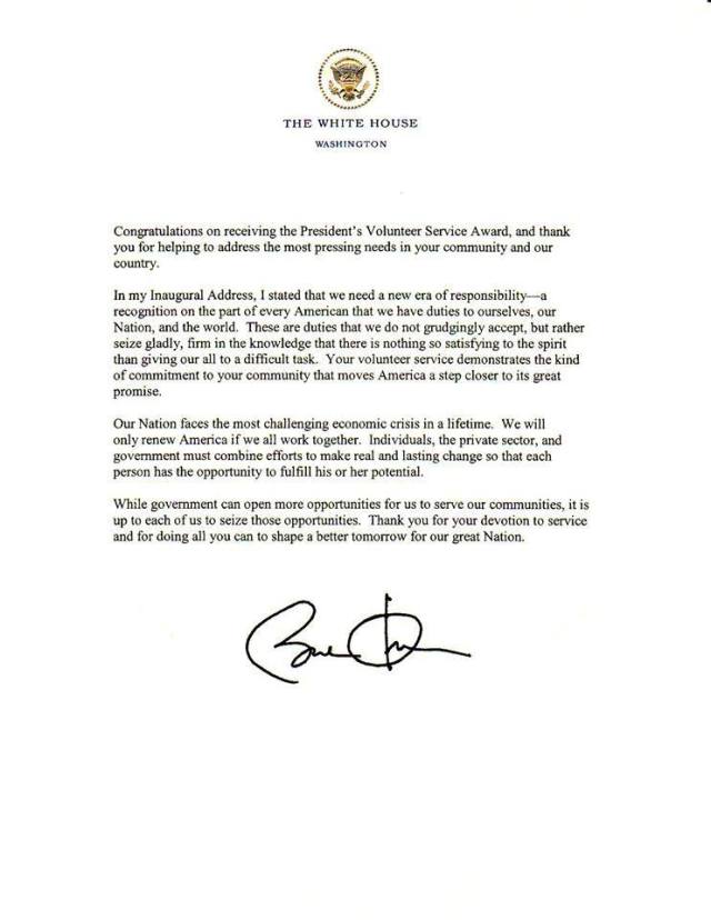 The President’s Volunteer Service Award was established by Executive Order of President George W. Bush in 2003. The award was established to honour volunteers that give hundreds of hours per year helping others through the President’s Council on Service and Civic Participation. The award can be granted to individuals, families and organizations. Depending on the amount of service hours completed, individuals can receive the Bronze, Silver, Gold, and/or the President’s Lifetime Achievement Award (now referred to as the Call to Service award). The President’s Lifetime Achievement Award is the most prestigious, and it has been awarded sparingly. Awardees may receive a personalized certificate, an official pin, medallion, and/or a congratulatory letter from the President depending on the award earned.