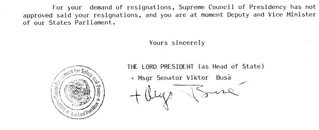 In protest at the situation, I withdrew European-American University from all connection with the ISPSP and resigned from all the offices I held personally. The response that I received from Archbishop Busa on 19 November was confused and contradictory; it at once gave support to my opponents, but also stated that Supreme Council of the Presidency had refused to accept my resignations.